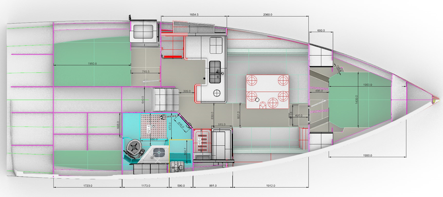 Er is een duidelijke reden waarom we op deze lengte niet kiezen voor een deksalon: de verhoogde deksalon moet immers tussen de gangboorden verrijzen. Dat maakt het interieur krapper, iets wat we terugzien op eigenlijk alle deksalons onder 45 voet. De Southerly 36, de Sirius maar het geldt ook voor de Garcia 45. Op de lengte van 45 voet gaat het net, maar voor een lange Nederlander eigenlijk net niet. In alle gevallen breng je het zwaartepunt van de boot omhoog.